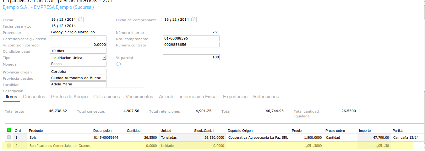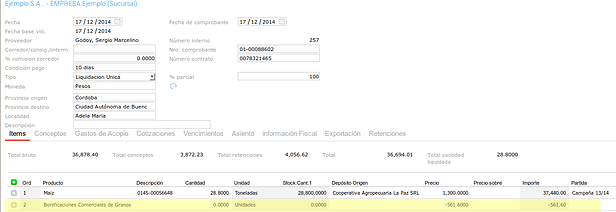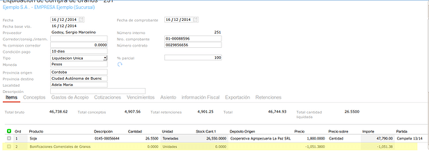 Para ver la nueva funcionalidad vamos a cargar un circuito de Compra de Granos. Primero para representar el primer modelo de descuentos en kilos: