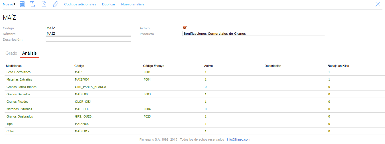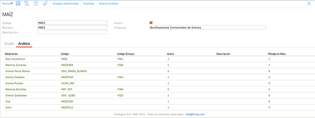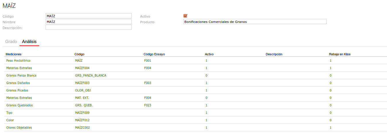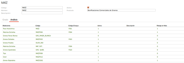 Para poder usar esta nueva funcionalidad debemos previamente efectuar una serie de configuraciones, para hacerlo nos vamos a: Granos → Granos - Más Temas → Medición, una vez aquí vamos a editar uno de los tipos de medición, en este caso el de MAÍZ, y allí vamos a efectuar las configuraciones: