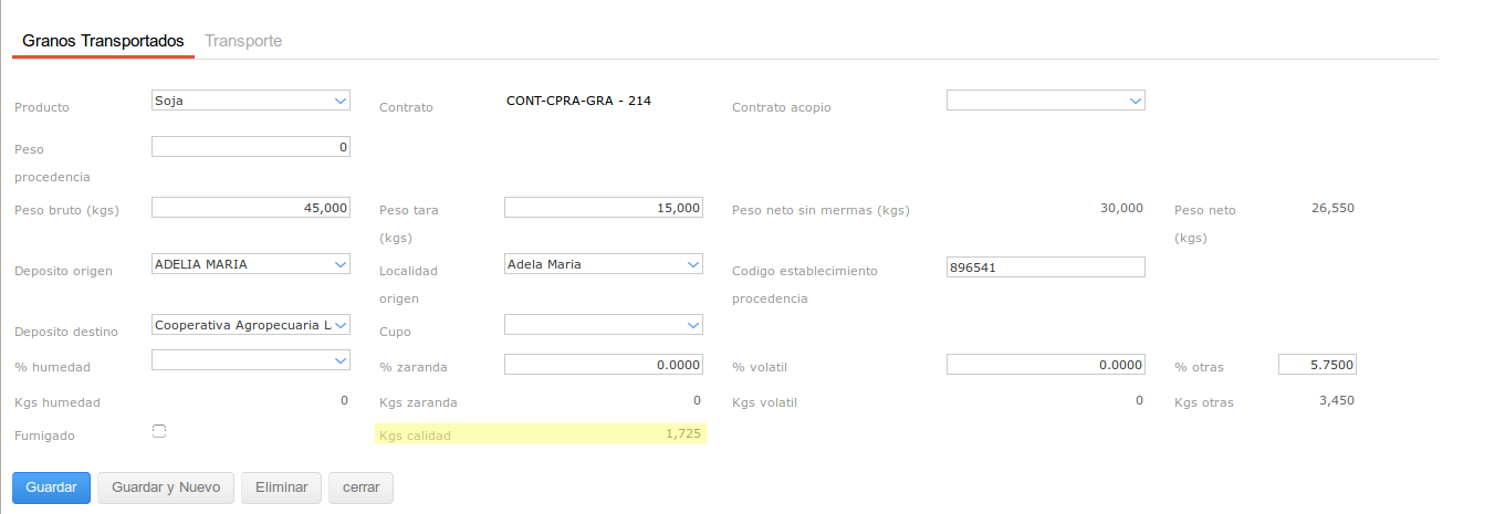 Como se vio hay dos Rubros que descuentan en kilos y uno que no. Por lo que se va a producir al momento de vincular la Medición de Calidad al Trasl. una merma física en kilos y además al momento de liquidar el Trasl. se va a generar un descuento de calidad en pesos que afecta el importe liquidado que va a cobrar el productor.