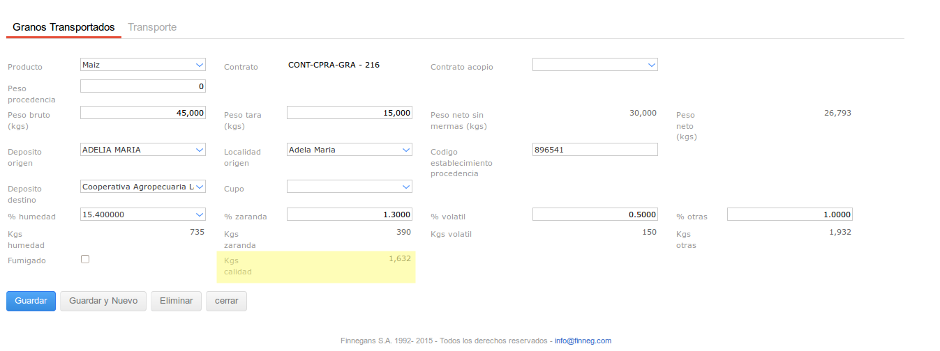 De acuerdo a la configuración que se hizo previamente sobre el tipo de medición MAÍZ y basándonos en los valores ingresados en la Medición de Calidad que se vinculo al Trasl. de Granos, se produjo un descuento de kilos sobre el mismo de 1632.