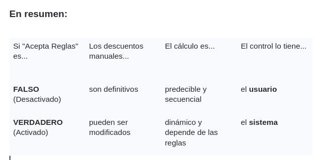 En este caso, el sistema toma el control. Primero, se ejecutan las reglas de negocio automáticas. Estas reglas pueden modificar o incluso ignorar los descuentos manuales que hayas aplicado.