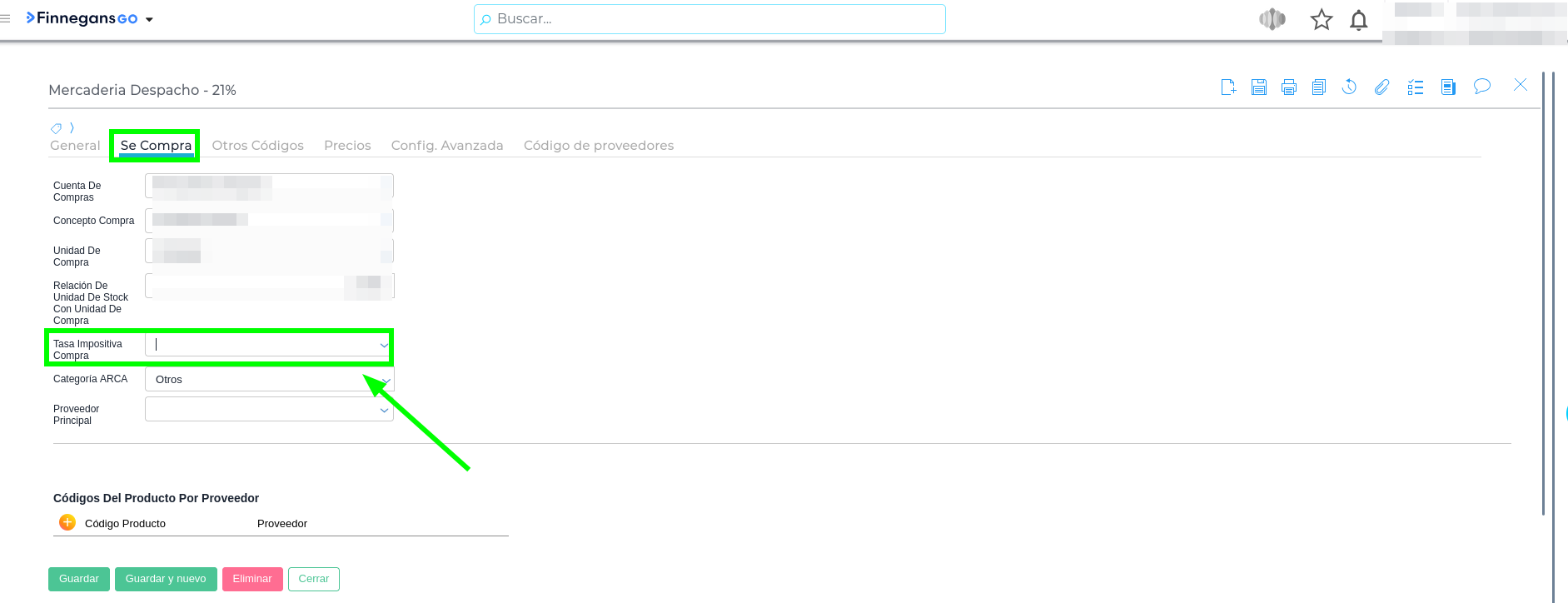 - Asegúrate de que el campo “Tasa Impositiva Compra” esté completo con la tasa impositiva correcta (Ejemplo: 21%).
