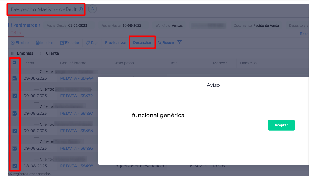 Al momento de querer generar despachos de manera masiva se visualiza un cartel de aviso.
