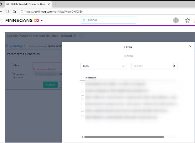 En la vista Detalle Panel Control Obra, los parámetros presentan obras que nunca fueron ingresadas.