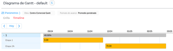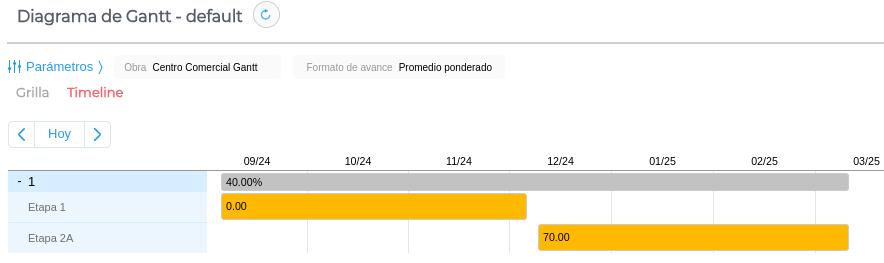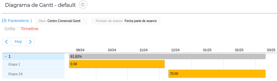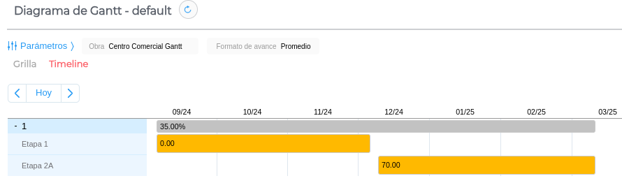 Paralelamente, podés ver los ítems agrupados por rubro, conocer el periodo de duración del rubro (delimitado por la fecha inicio de ítem más anterior y por la fecha fin ítem más posterior) y su avance según distintos criterios.