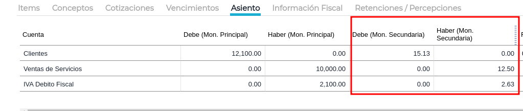 Dada una Factura de Venta cuyo asiento en moneda secundaria, cotización 1 USD = $800, es el siguiente:
