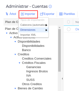 Para incorporar una dimensión de manera masiva se debe ingresar al Maestro de Cuentas y utilizar la opción de “Importar”.
