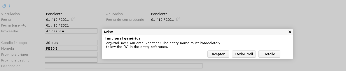 Se emite el mensaje de advertencia “org.xml.sax.SAXParseException: The entity name must immediately follow the “&” in the entity reference.” al guardar una transacción.