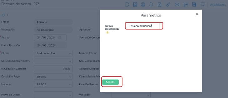 Una vez aceptado, se refrescará la transacción con la nueva descripción: