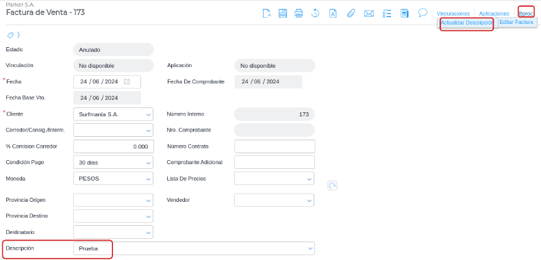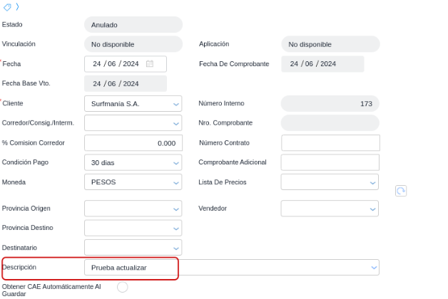 Mediante el uso del BProc “Editar factura” se podrá editar la descripción en facturas o puntos de venta, aunque las mismas ya hayan obtenido CAE.