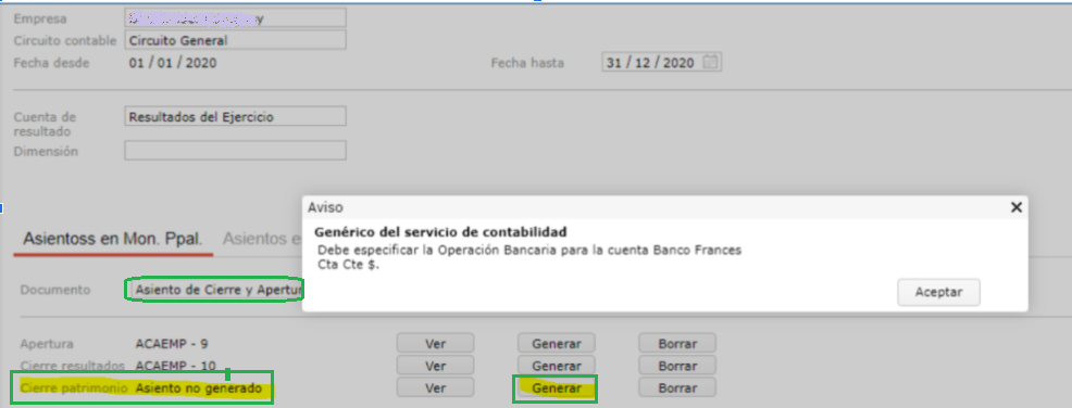 Consulta: Al generar asiento de Cierre patrimonio el sistema emite el mensaje: “Debe especificar la operación bancaria para la cuenta banco Francés Cta.Cte.$ “