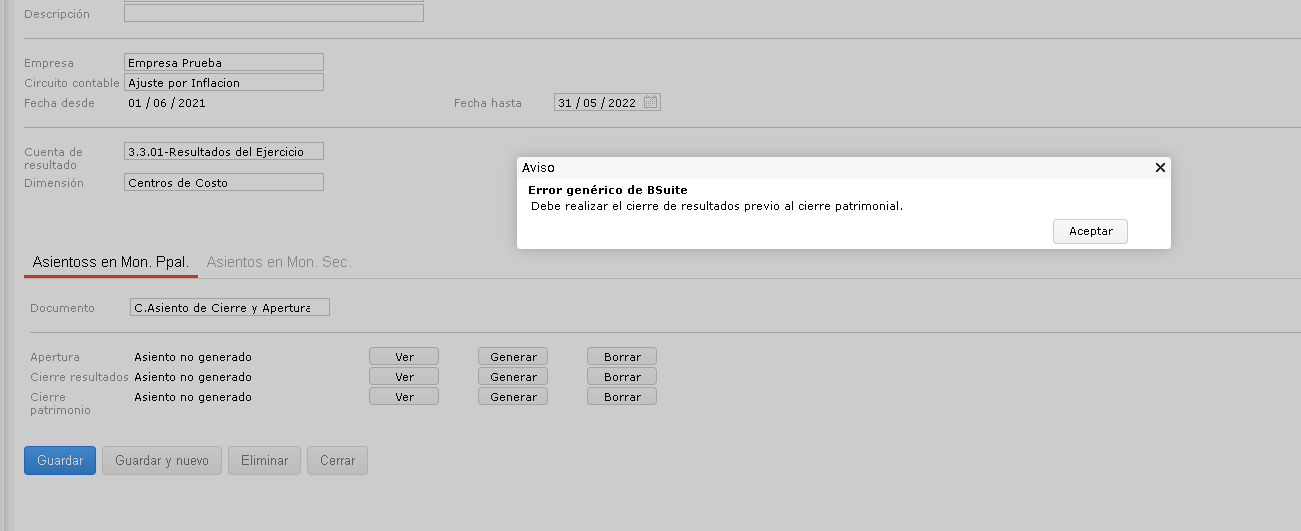 El sistema emite el mensaje “Debe realizar el cierre de resultados previo al cierre patrimonial” al generar un asiento de cierre patrimonial en ejercicios contables.