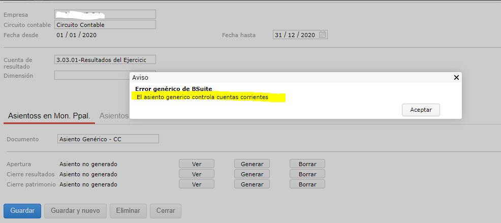 El sistema emite el mensaje “El asiento genérico controla cuentas corrientes” al generar un asiento de apertura/cierre en ejercicios contables.
