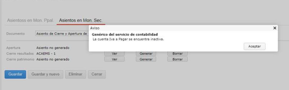 El sistema emite el mensaje “Genérico de servicio de contabilidad - La cuenta (nombre de la cuenta) se encuentra inactiva”. al generar un asiento de apertura/cierre en ejercicios contables.