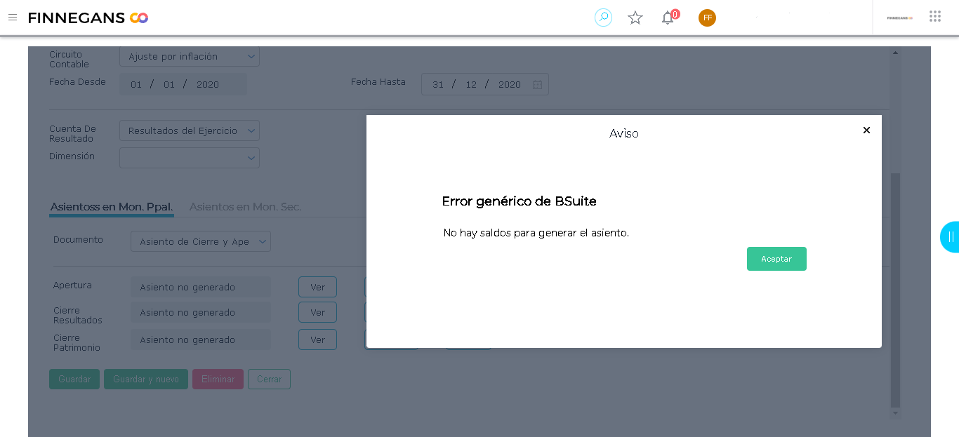 El sistema emite el mensaje “El asiento genérico controla cuentas corrientes” al generar un asiento de apertura/cierre en ejercicios contables.