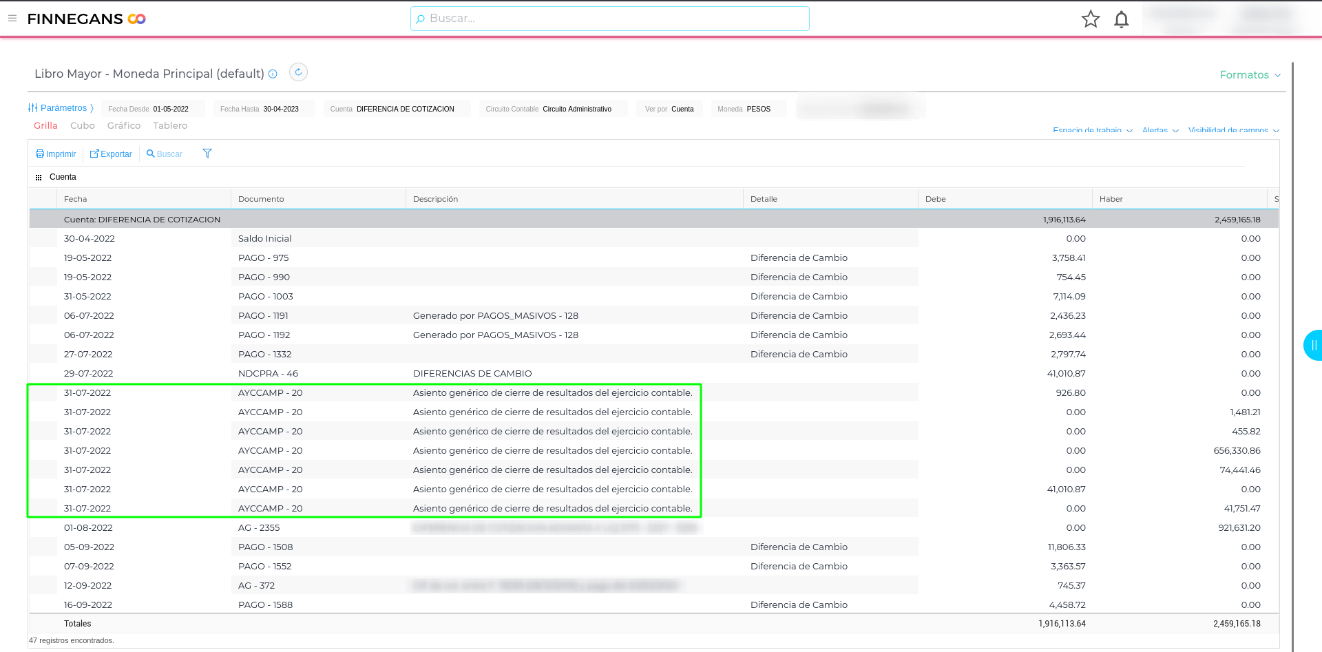 El asiento de cierre de resultados se repite en varias filas al consultar una cuenta en el libro mayor. Esto puede generar distintas inconsistencias en los ejercicios contables, tales como saldos inconsistentes o la repetición de líneas de manera errónea