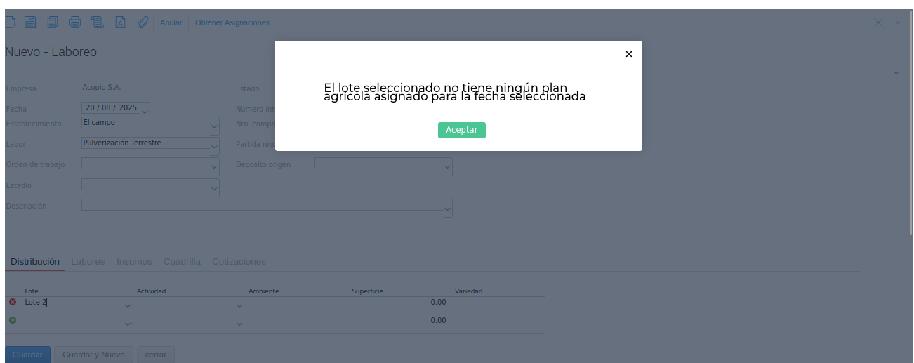 Al intentar realizar un laboreo, el sistema reporta “El lote seleccionado no tiene ningún plan agrícola asignado para la fecha seleccionada.”