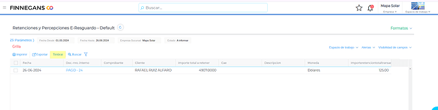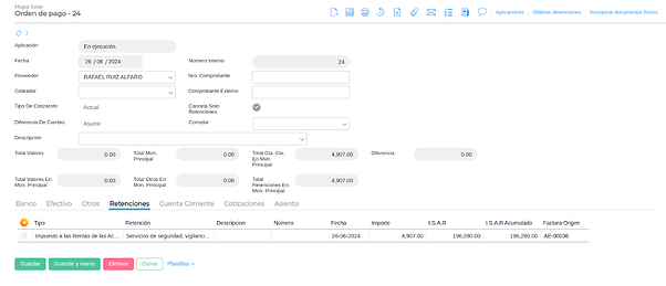 En el siguiente ejemplo solo se cancelan las solo retenciones. Para ello, mediante el asistente se selecciona la factura y se activa el check Aplica solo sobre retenciones
