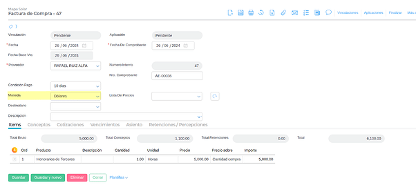 El modo de uso se explicará mediante la carga de una factura en dólares.