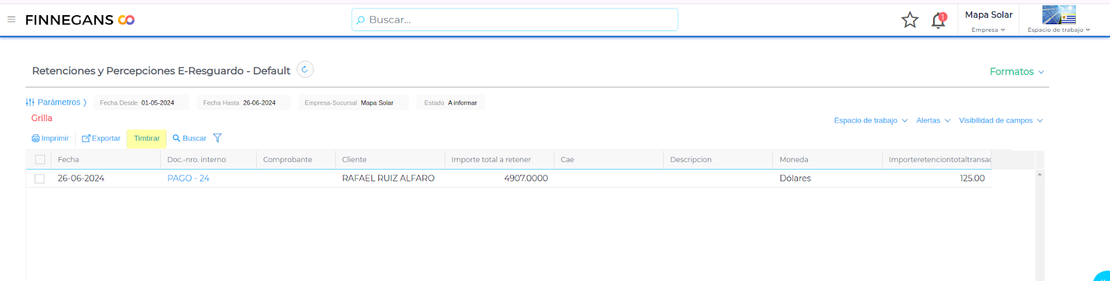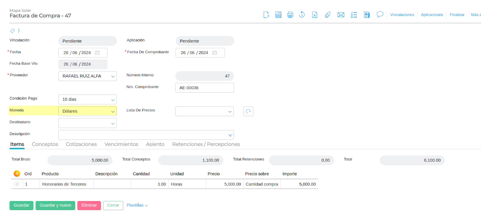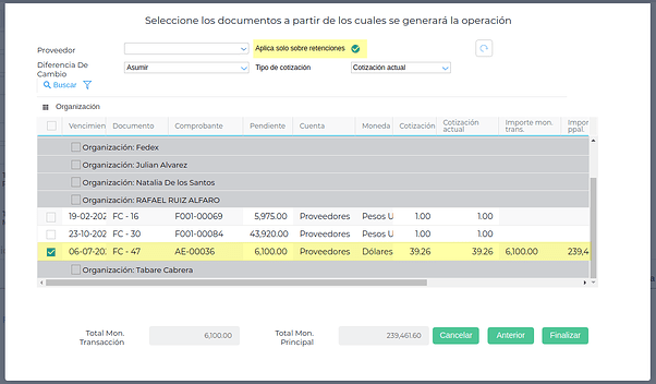 Cargar una factura de compra en dólares. Verificar que el proveedor tenga configurada la retención que se aplica en operación tesorería.