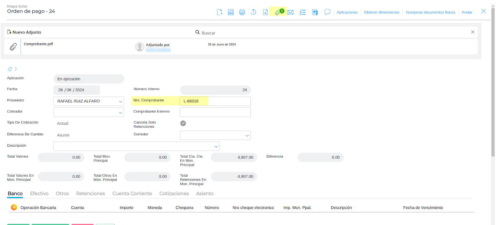 Al ingresar a la orden de pago se puede observar que ya cuenta con número de comprobante (CAE) y un adjunto.