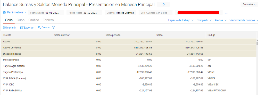 Al realizar el asiento de apertura del ejercicio, se pueden visualizar las cuentas en el Libro Mayor, pero en el balance de sumas y saldos no se informan los saldos de las cuentas del período anterior.