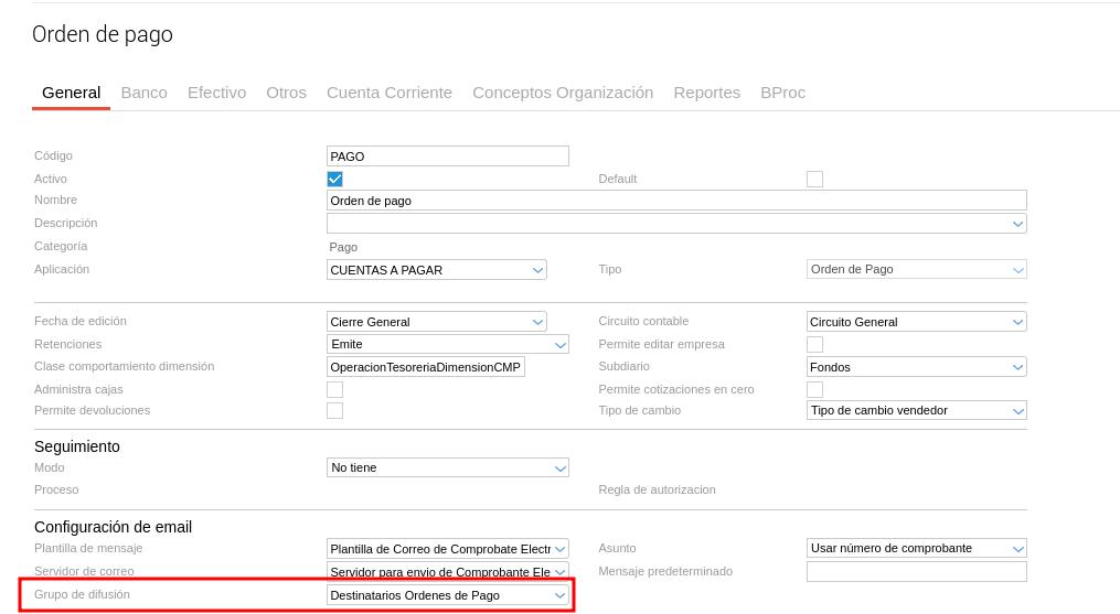 Ir al Maestro “Tipo de Documentos”, solapa “Generales”, grilla “Configuración de Email”. En el campo “Grupo de Difusión” especificar el “Grupo de difusión” que hemos creado en el “Maestro de Grupos de Difusión”.