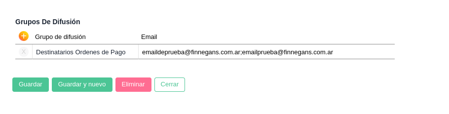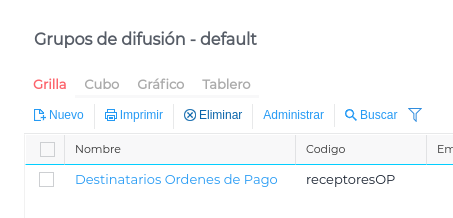 Ir al maestro de Grupos de Difusión y crear un nuevo “Grupo de Difusión”. Se deben crear tantos Grupos de Difusión como segmentos de destinatarios deseemos. Por ejemplo, “Destinatarios Órdenes de Pago” lo utilizaremos para el envío de los documentos OP.