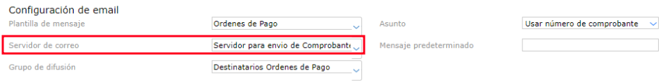En el campo “Servidor de correo” debe seleccionarse la configuración que se haya creado para el envío de los emails.