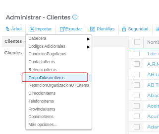 Para esto, dirigirse a Clientes/Proveedores → Administrar → Importar → GrupoDifusionItems: