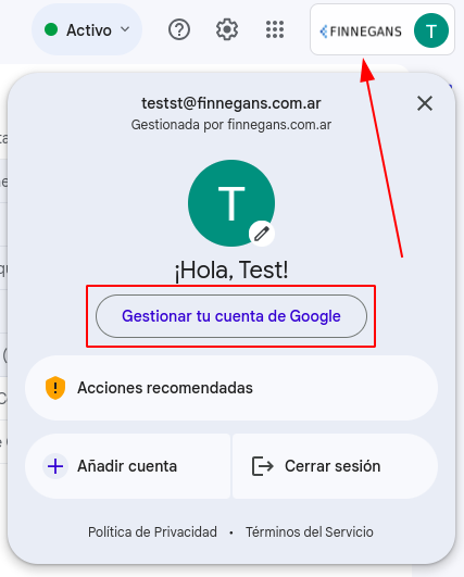 - Lo primero que hay que hacer es iniciar sesión en Gmail. Una vez conectado a la cuenta, acceder al menú de configuraciones. Se encuentra en la parte superior derecha del navegador, en el círculo del avatar. Luego elegir la opción «Cuenta de Google»