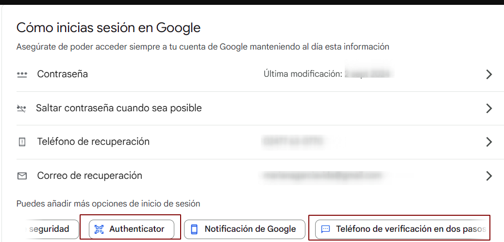 Acceder al apartado «Cómo inicias sesión en Google» y pulsar en «Authenticator o Teléfono de verificación en dos pasos»: