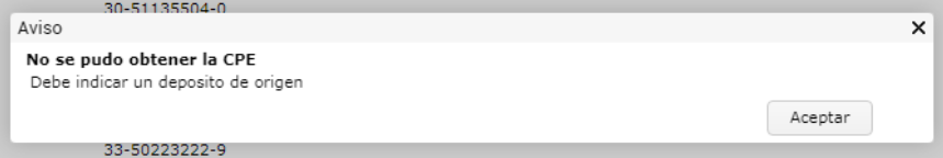 El sistema devuelve un mensaje de error al intentar obtener CPE que dice que falta indicar el depósito de origen.