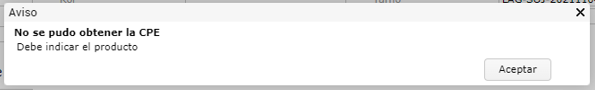 El sistema devuelve un mensaje de error al intentar obtener CPE que dice que falta indicar el producto.