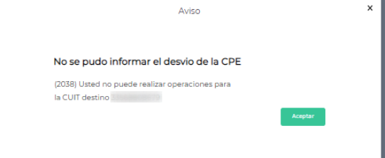 Al generar un desvío de Carta de Porte Electrónica, el sistema arroja el siguiente error: (2038) Usted no puede realizar operaciones para la CUIT destino.