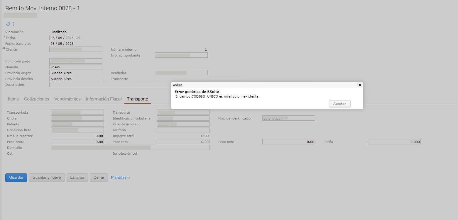 “Error genérico de BSuite El campo CODIGO_UNICO es inválido o inexistente”: