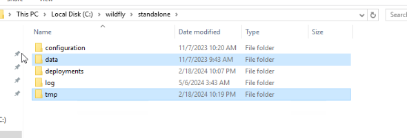 Detener el servicio **Wildfly" y borrar las carpetas tmp y data en C:\wildfly\standalone\