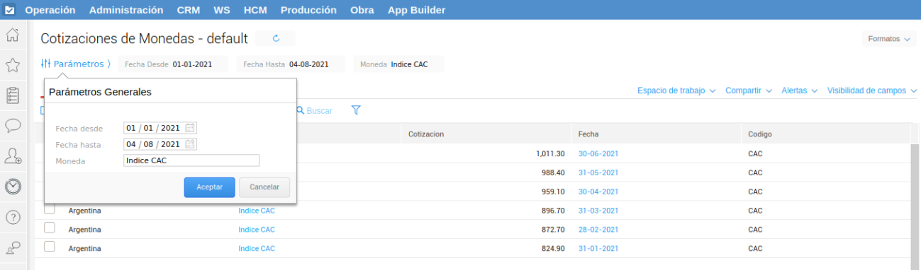 Requiere actualizar el índice CAC desde el maestro de cotizaciones de monedas.