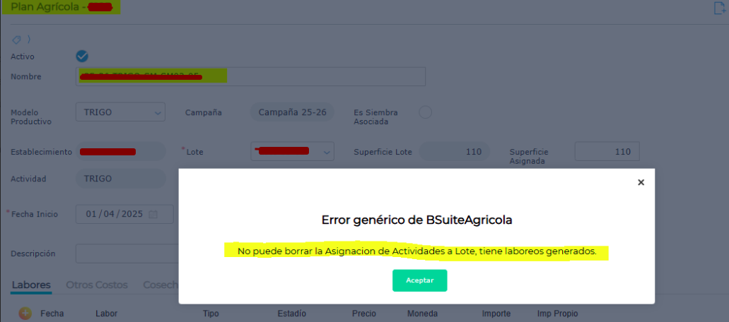 Respuesta: Lo que el sistema está indicando, es que hay algo relacionado al Plan Agrícola que queremos eliminar, y por eso el sistema no permite completar la acción.