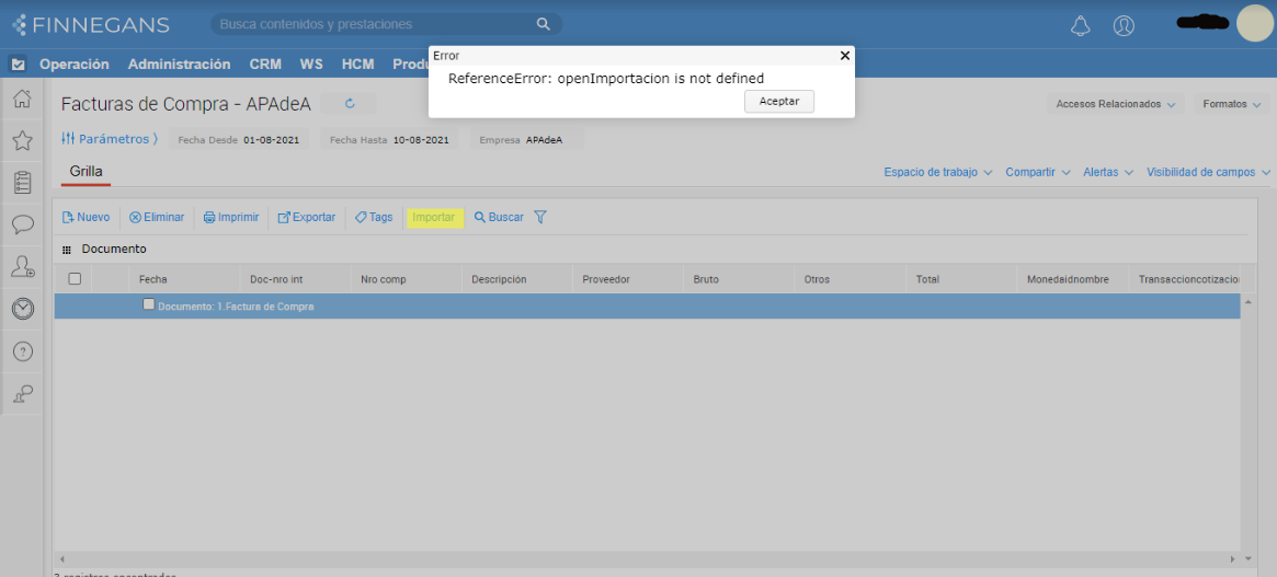 Error “ReferenceError: openImportacion is not defined” al importar masivamente facturas de compras desde un archivo Excel