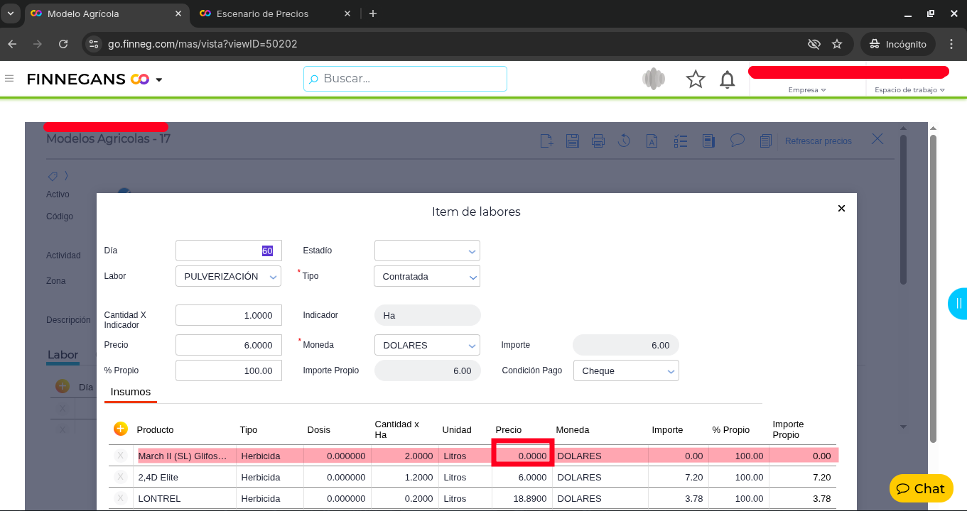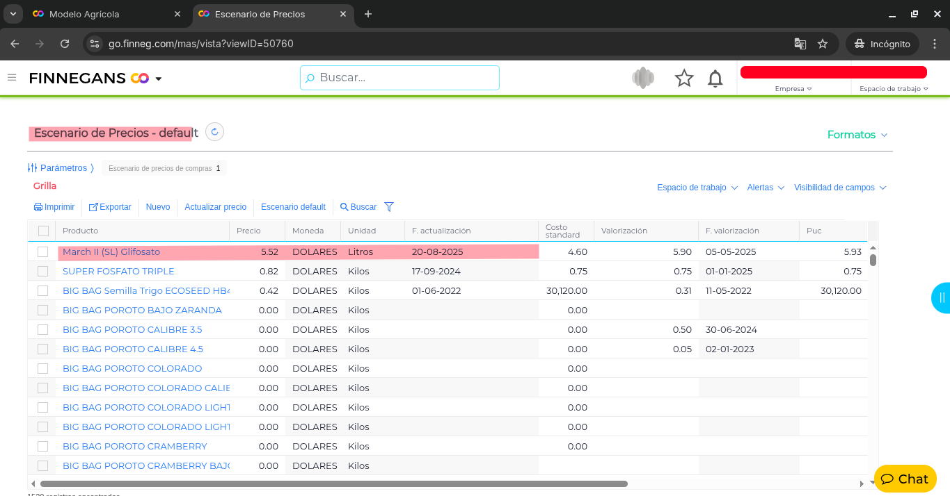 Los modelos agrícolas no están actualizando automáticamente los precios de los insumos según el escenario de precios asignado.