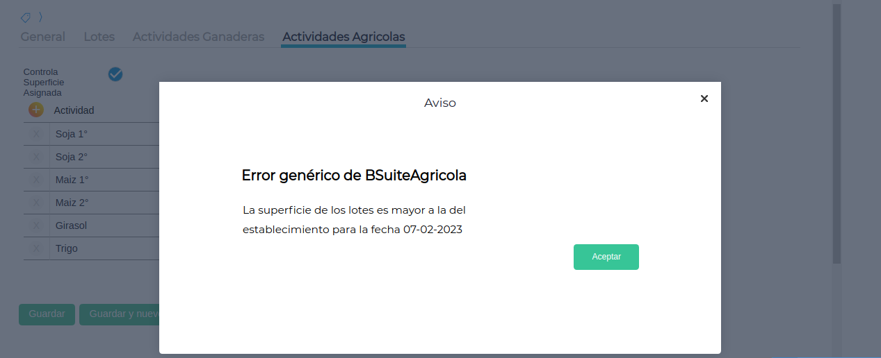 A la hora de marcar el check de la opción de "Control de Superficie Asignada " en los distintos establecimientos, el sistema emite un mensaje de error que describe que: