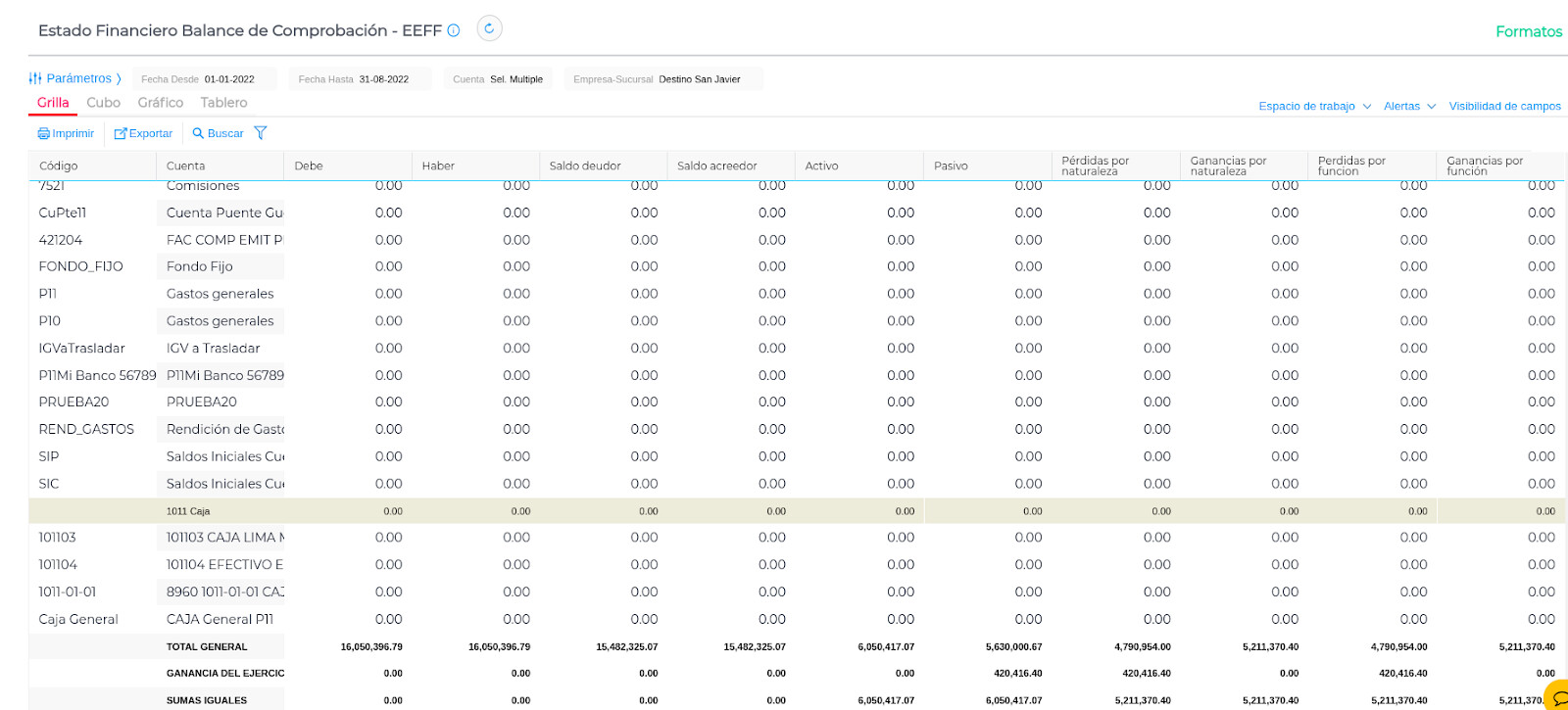 - Debe iguala con Haber en la fila Total General