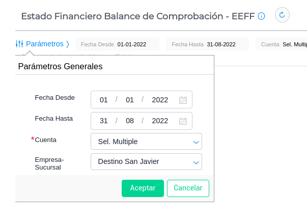 Ingresar a Gestión Empresarial → Contabilidad → Estados Financieros → Estado Financiero Balance de Comprobación