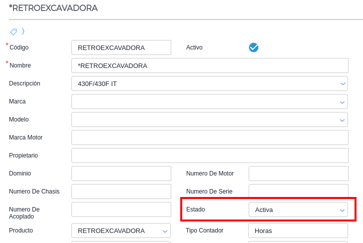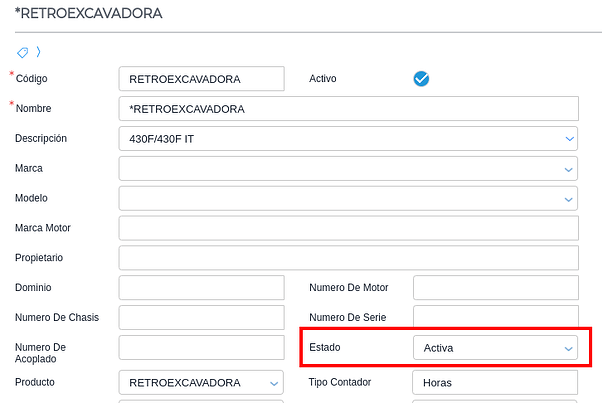 Siguiendo el ejemplo de la Retroexcavadora, la misma posee el estado “Activa”.