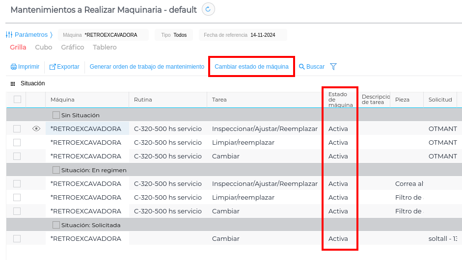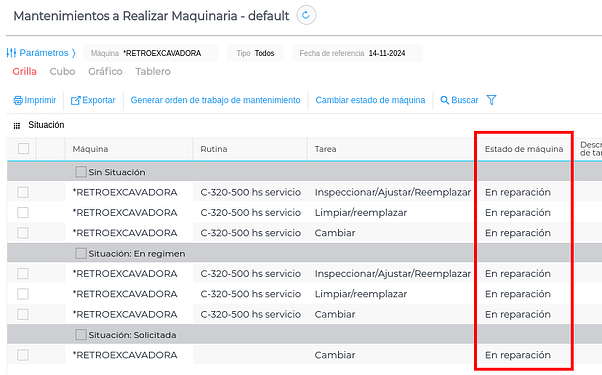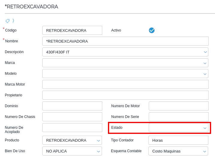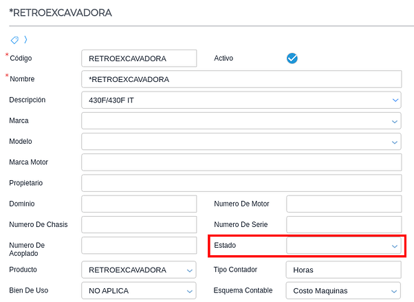 Dentro de cada maquinaria, se encuentra el campo Estado para completar con el estado que se necesite: