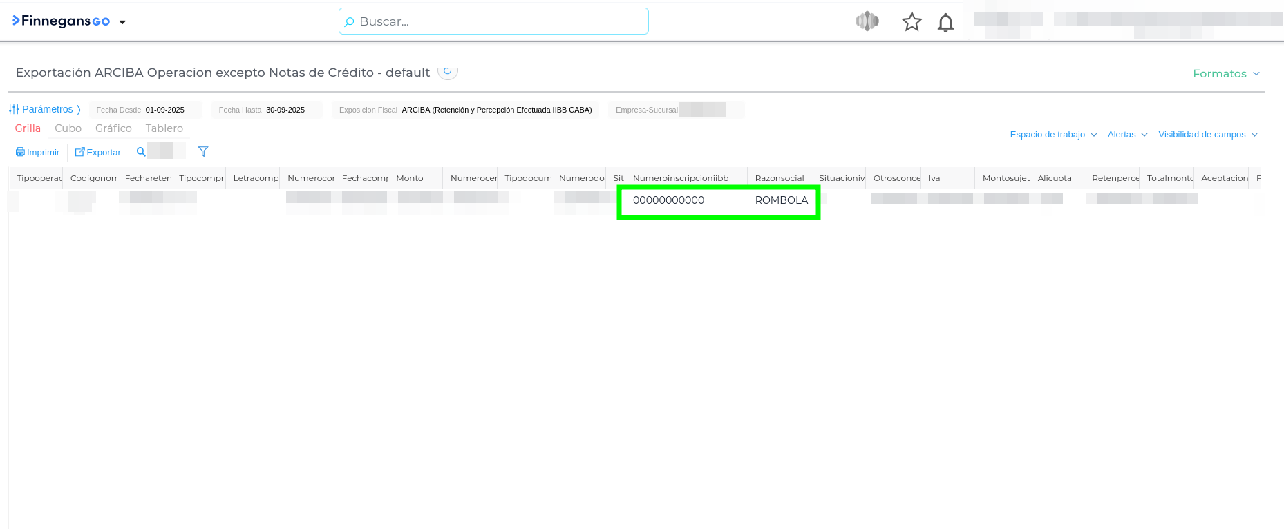 - Guarda los cambios en la ficha del proveedor y vuelve a ejecutar el informe Exportación ARCIBA Operación excepto Notas de Crédito para verificar la corrección.
