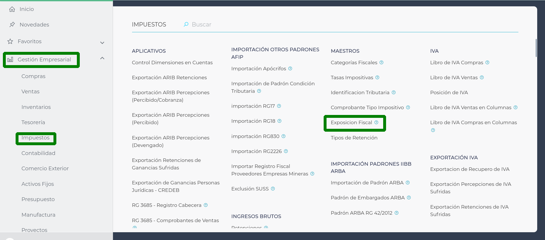 - Desde el Menú > Gestión empresarial > Impuestos > Exposición Fiscal