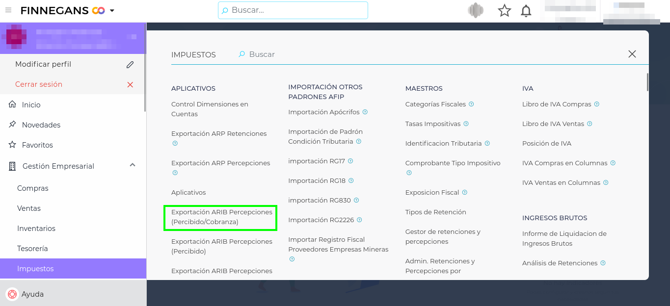 1- Ingresar a Menu → Gestion Empresarial → Impuestos → Aplicativos → Exportación ARIB Percepciones (Percibido/Cobranza).