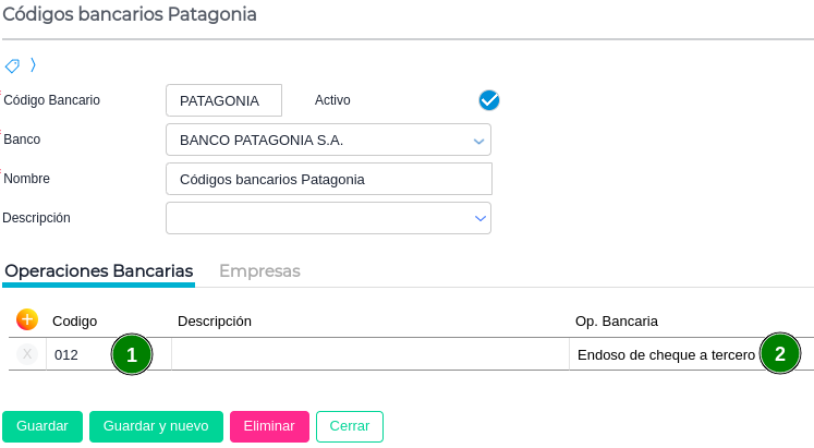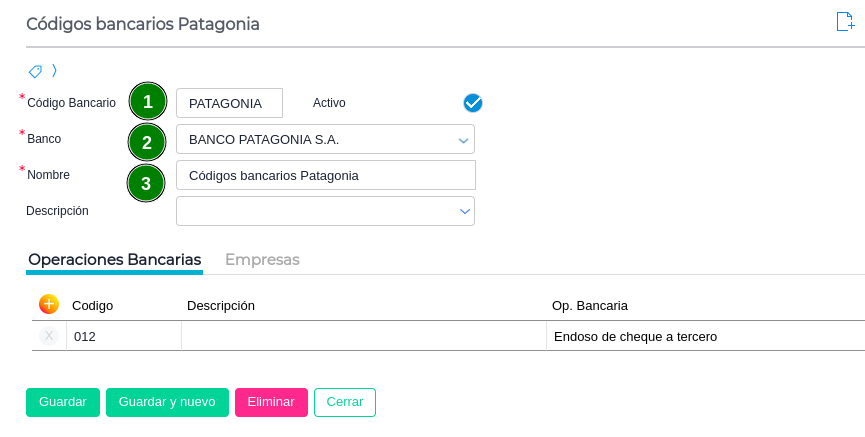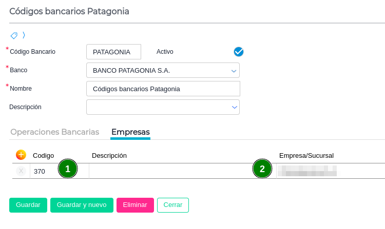 - Grupo código bancario: seleccionar el código bancario creado correspondiente al Banco Patagonia